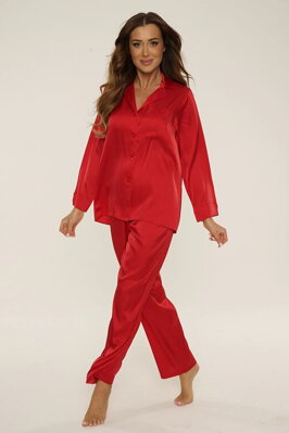 Luxusní červený saténový komplet s dlouhými rukávy a knoflíkovým...