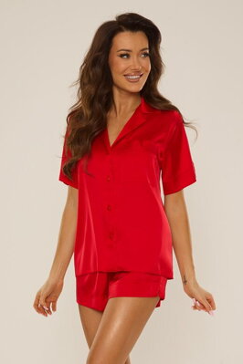 Elegantní červený saténový komplet s krátkými rukávy a límečkem,...
