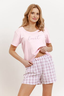 Dámské růžové bavlněné pyžamo s krátkým rukávem, srdíčkovým vzorem...