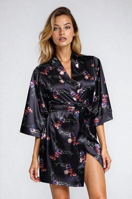 Krátký dámský saténový župan v černé barvě, ideální na doma i na...