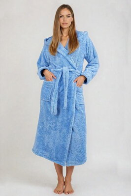 Dámský huňatý župan delšího střihu (v délce cca 120 cm), v modré...