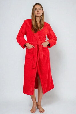 Dámský dlouhý huňatý župan v červené barvě s šálovým límcem.
