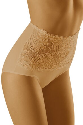 Dámské béžové kalhotky s vysokým pasem zdobené krajkou.