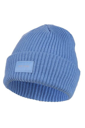 Zimní čepice beanie má modrou barvu, je pletená a má přizpůsobivý střih.