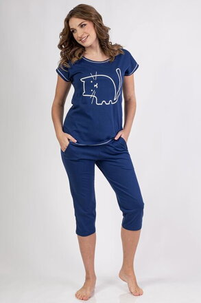 Dámské pyžamo Mici má vepředu ozdobný potisk kočky, je tmavě modré a má velice pohodlný materiál vyrobený z bavlny.
