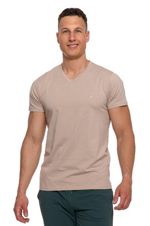 Pánské bavlněné tričko má slušivý slim fit střih zdůrazňující oblast ramen a neutrální béžovou barvu.